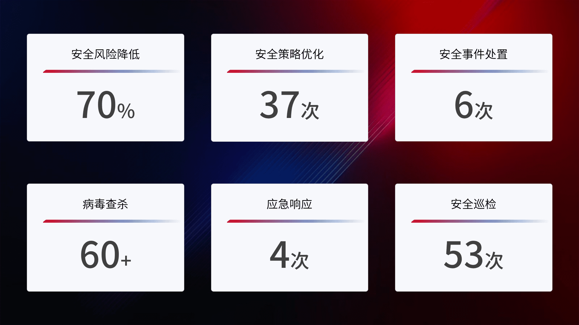 提供全面的安全事件报告体系,,,,包括处置报告、、、、周报、、、、季度和年度总结,,,,结合持续监控,,,,帮助客户深入了解网络安全状况。。。