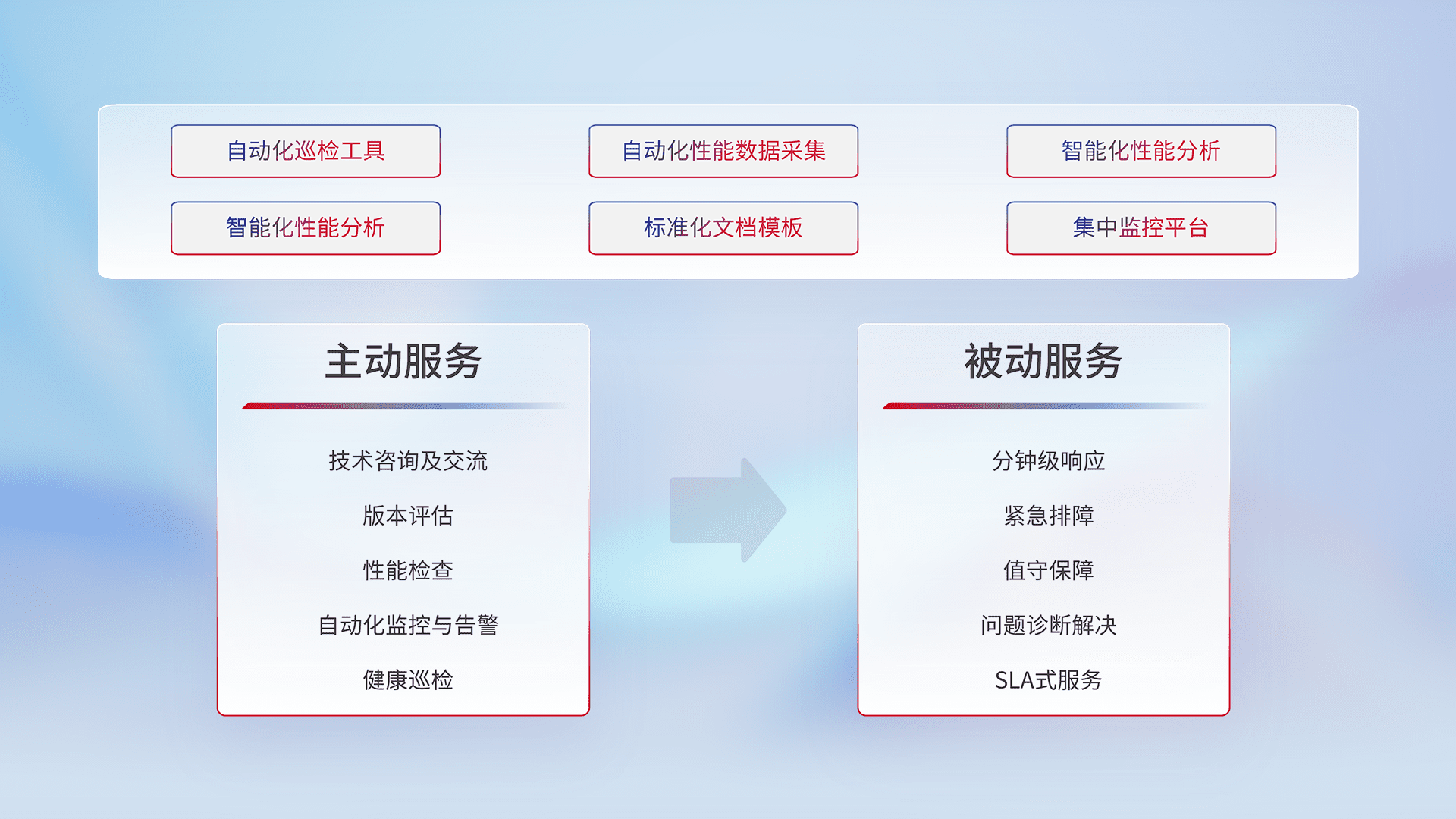 智能化工具和标准化文档,,,保障服务质量,,,提供主动服务(包含技术咨询、、版本评估、、性能检查、、、自动化监控与告警、、、、健康巡检)和被动服务包含(分钟级响应、、、、紧急排障、、、值守保障、、、问题诊断解决、、SLA服务)。。。。